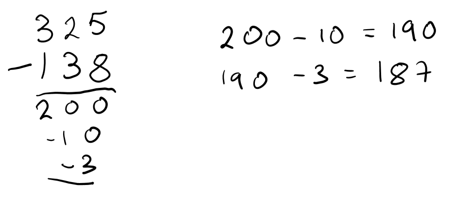 An alternative method is to incorporate negative numbers, allowing students not to worry if the bottom number is larger than the top number. If students understand negative numbers, this method is surprisingly straightforward. Starting from the left, consider the place value: for example, 300 – 100 = 200, then 20 – 30 = -10, and finally 5 – 8 = -3.